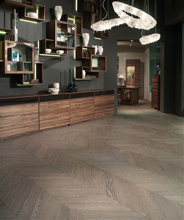 Паркетная доска, дуб, елочка, брашированная, тонированная, покрыта лаком