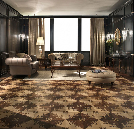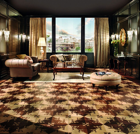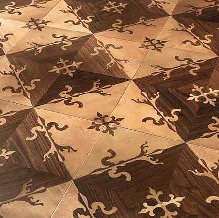Художественный паркет из древесины американского ореха и клена, инкрустированный вручную, крашеный, с эффектом старения, покрыт лаком