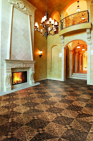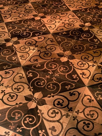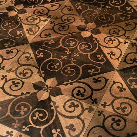 Художественный паркет из древесины американского ореха и вишни, инкрустированный вручную, крашенный, с эффектом старения, покрыт лаком