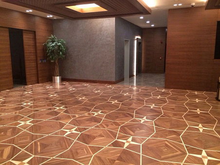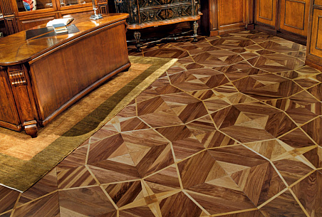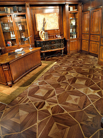 Художественный паркет из древесины американского ореха, с вставками из вишни, выполненной вручную, патинированный, с эффектом старения, покрыт лаком или маслом