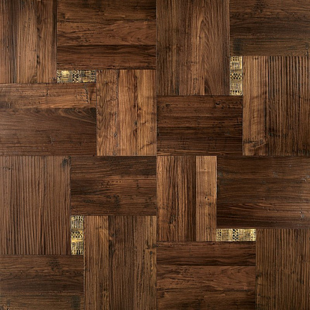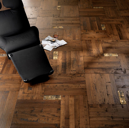 Художественный паркет из американского ореха, инкрустированный вручную, струганый вручную, состаренный, с вставками из художественной керамики с золотом, крашеный, покрыт лаком