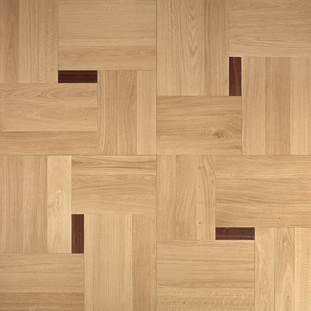 Художественный паркет из древесины дуба, инкрустированный вручную, брашированный, слегка отбеленный, с вставками из американского ореха, покрыт лаком или маслом