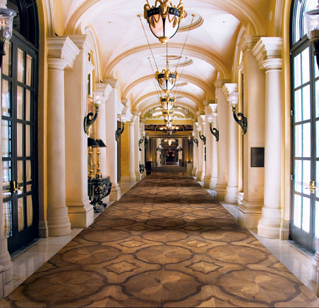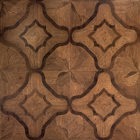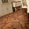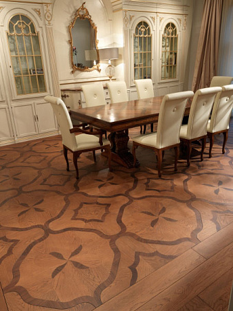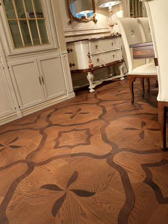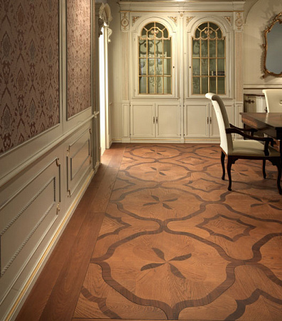 Художественный паркет из древесины дуба, инкрустированный вручную, с вставками из американского ореха и дуба копченого, брашированный, крашеный, состаренный, покрыт лаком